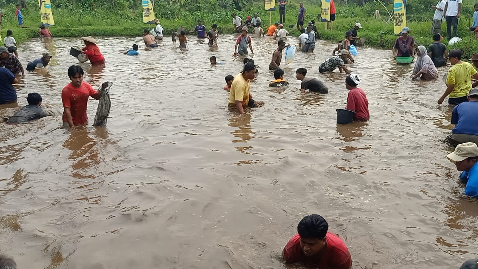 Lebih lanjut lurah menyampaikan sebanyak 100 kg ikan yang kita lepas di empang ini dan juga kita berikan Doorprez bagi yang mendapatkan ikan warna kuning langsung mendapatkan bonus Rp 50.000, kata lurah.