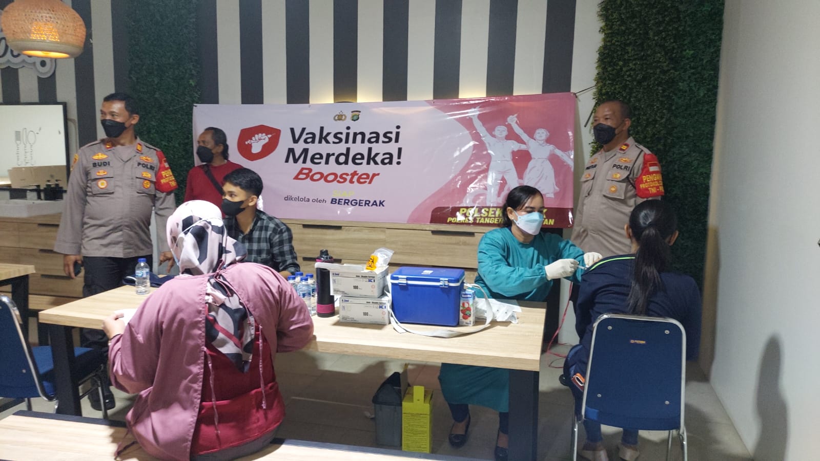 Kegiatan Vaksinasi Merdeka Booster di Wilkum Polsek Legok dipimpin langsung oleh Kapolsek Legok Akp Budi Harjono, kegiatan ini merupakan program Polda Metro Jaya dalam percepatan Vaksinasi Covid 19 khususnya vaksin Booster.