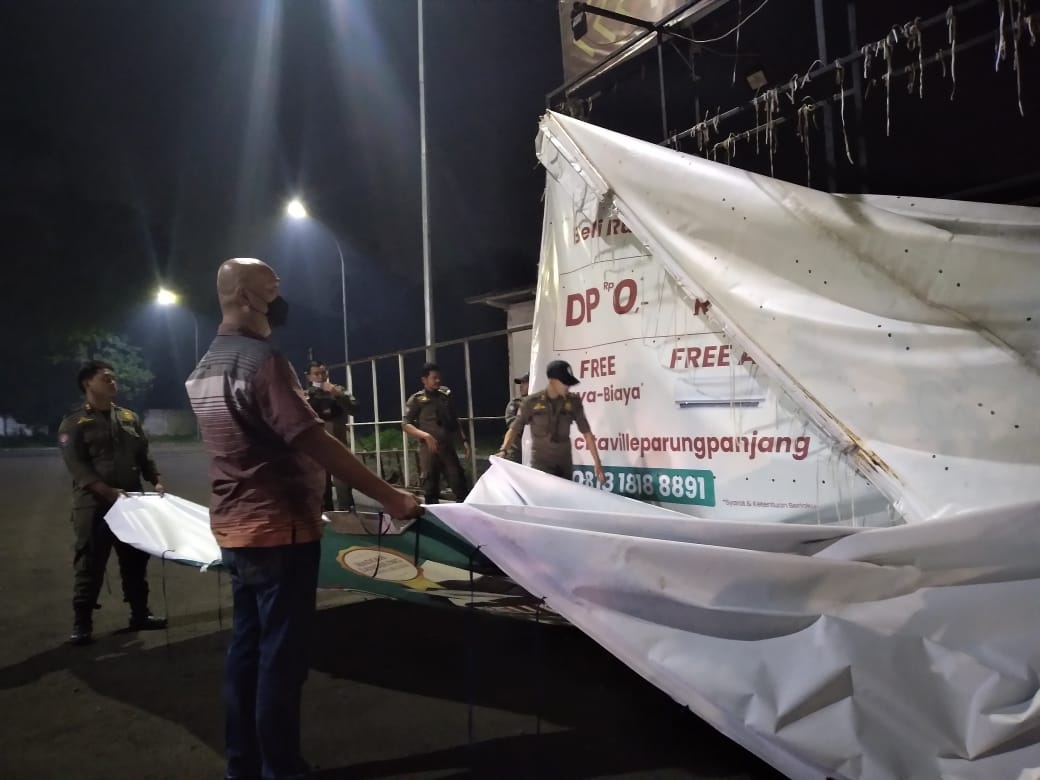 BantenOne-Tangerang Selatan – Satuan Polisi Pamong Praja (Satpol PP) Kota Tangerang Selatan (Tangsel) kembali mencopot ratusan reklame tak berizin di 2 Kecamatan, Serpong dan Setu pada Senin dini hari, (18/4/2022).