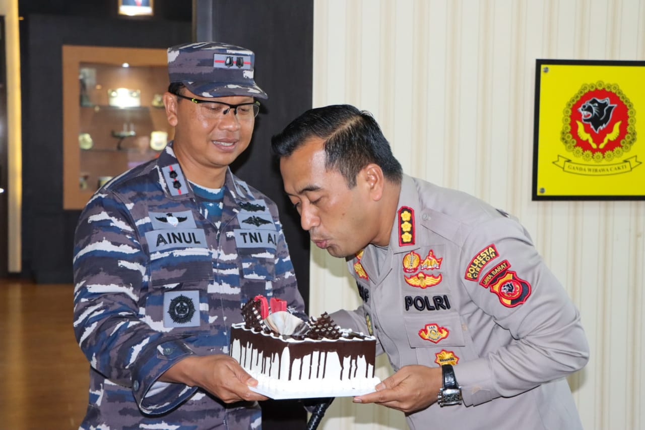 BantenOne.com ,Cirebon- Dandim 0620/ Kabupaten Cirebon Letkol Inf. Faurizal Noerdin, dan Danyon Arhanud 14/PWY Cirebon Letkol Arh. Dedy Hendaryatmoko, Danlanal Cirebon Letkol Laut (P) Ainul Muslimin, Hanla, memberikan kejutan Hari Bhayangkara Ke-76 kepada Kapolresta Cirebon, Kombes Polisi Arif Budiman, bertempat di Mapolresta Cirebon, Jumat (01/07/2022).