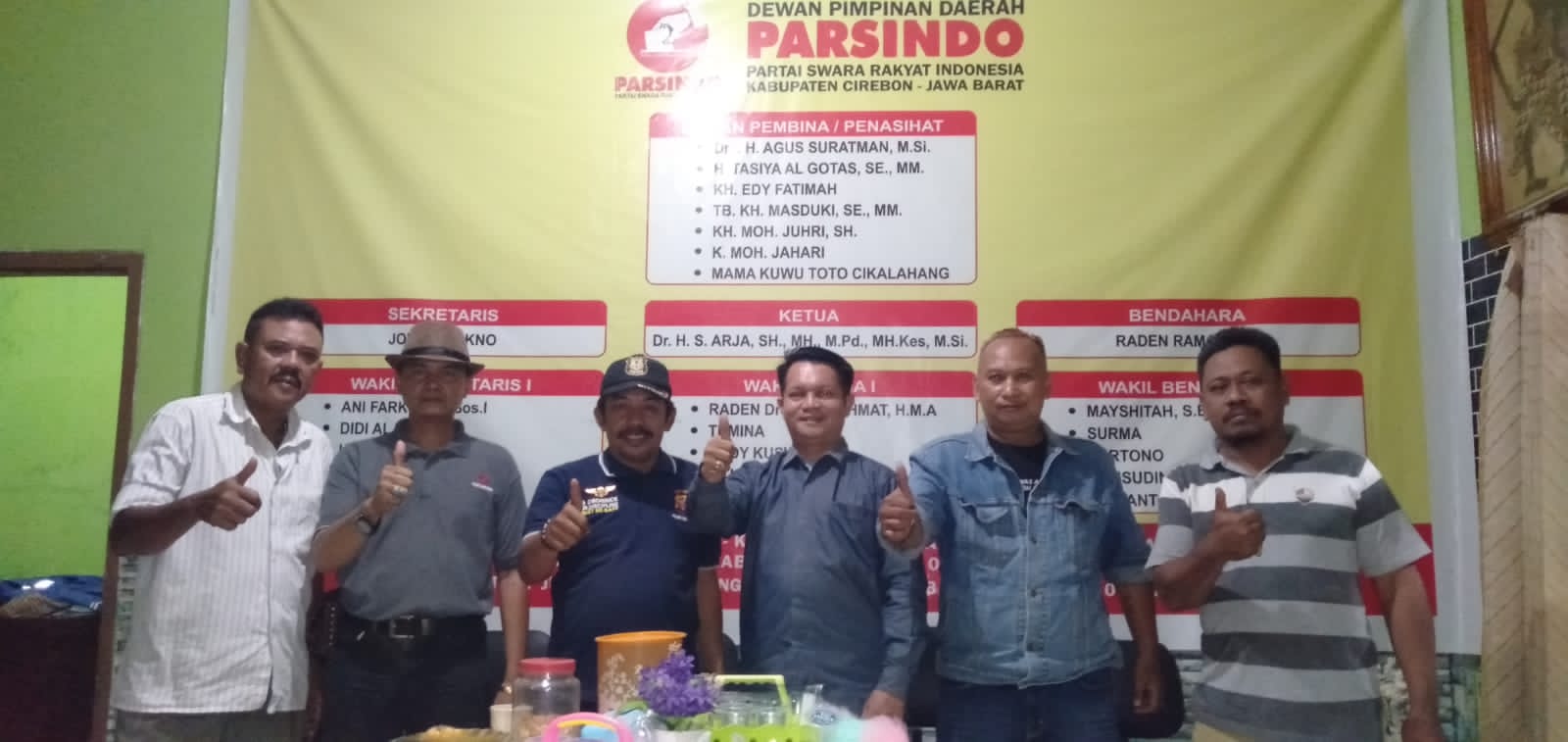 Dr. H. Slamet Arja. Selaku Ketua Umum Partai Parsindo DPD Kabupaten Cirebon, menyampaikan, bahwa Partai Parsindo yang baru Lahir diera Pasca Covid -19, namun kami siap untuk mencetak Anggota Legeslatif ditiap – tiap Dapil dengan perolehan kursi Dewan Satu Dapil minimal 1 sampai 2 Dewan dikursi DPRD. Paling tidak Parsindo memiliki satu Fraksi atau 5 Anggota Dewan. Ujarnya