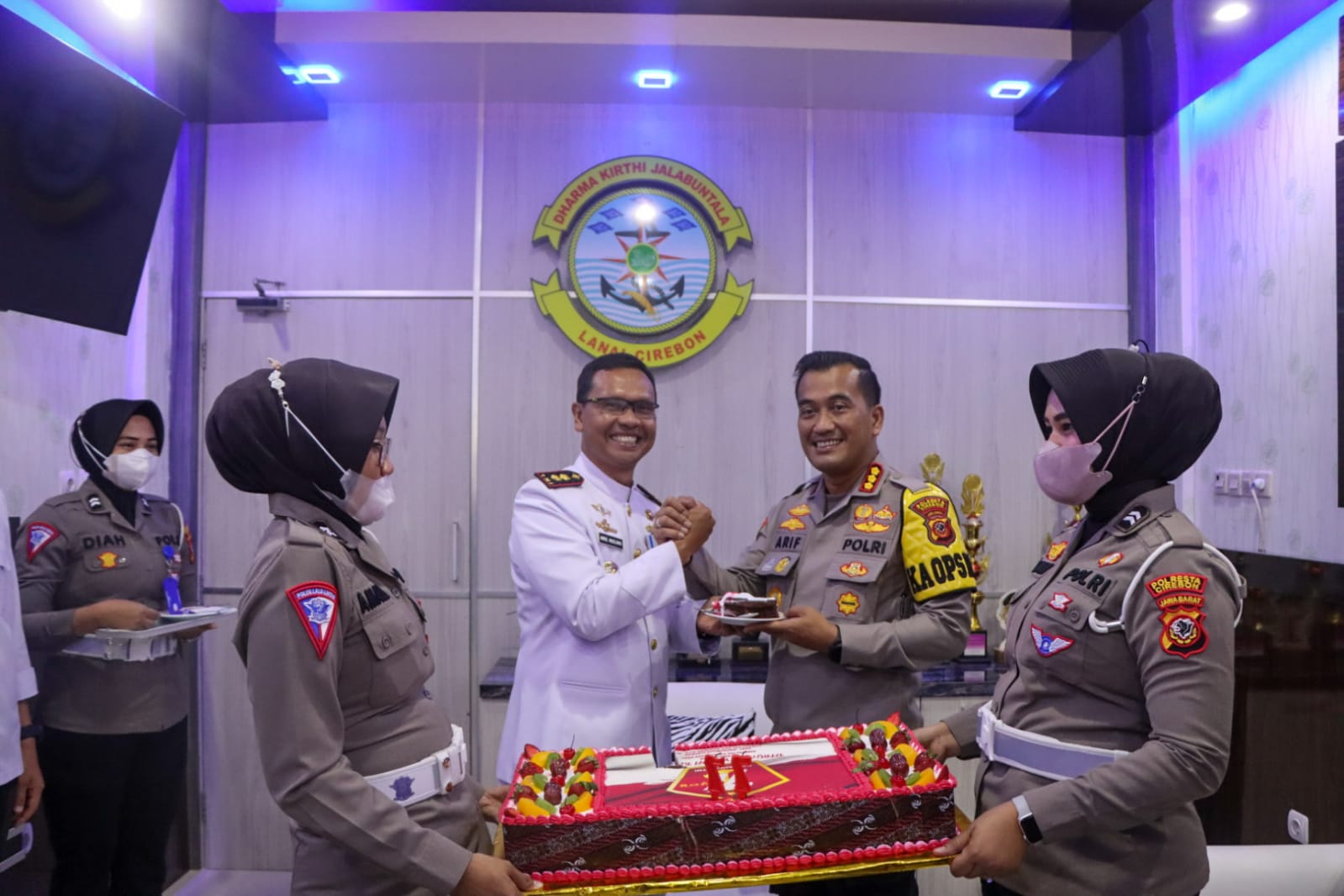 Kapolresta Cirebon, Kombes Polisi Arif Budiman, bersama Plt Waka Polresta Cirebon, Kompol Purnama, dan para Kabag, Kasat, serta Kapolsek jajaran mendatangi seluruh Mako TNI tersebut sambil membawa Kue Ulang Tahun lengkap dengan lilin angka Ke-77 Tahun.