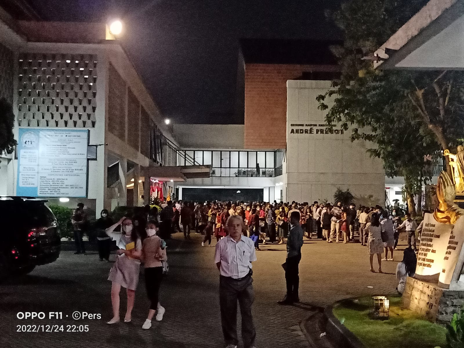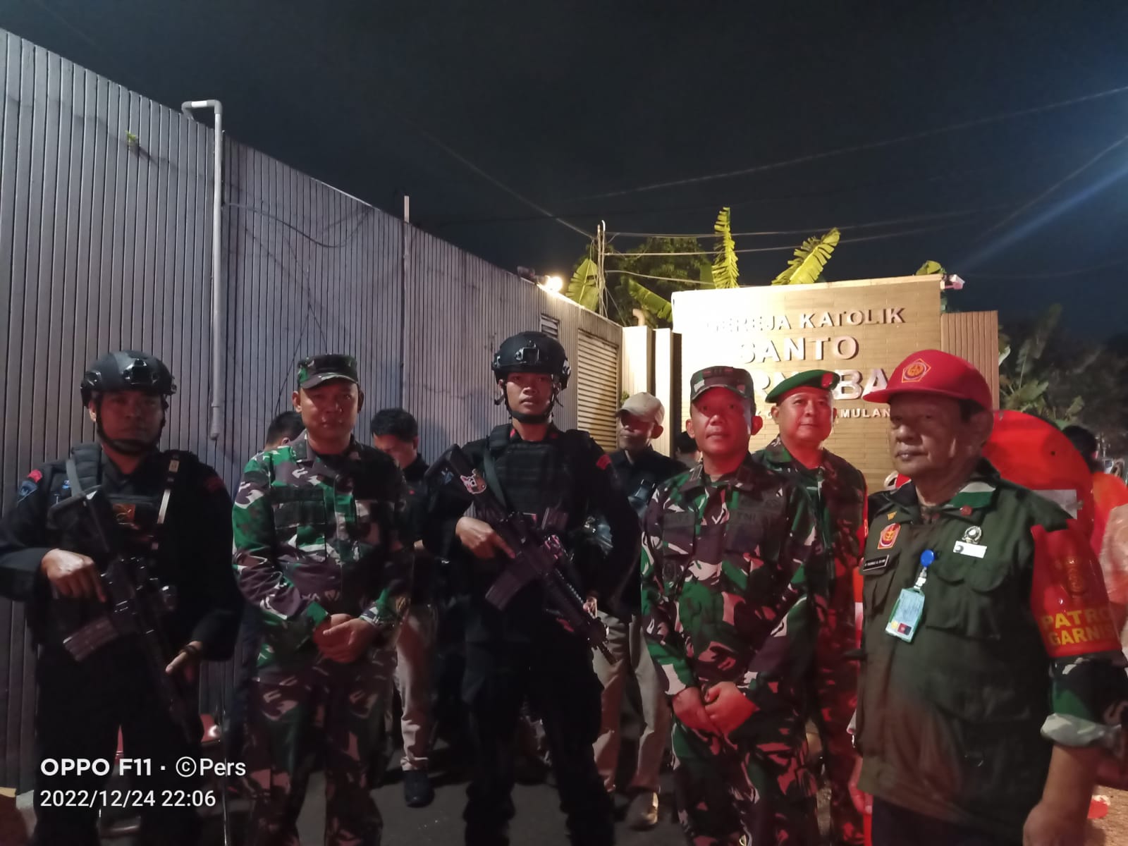 BantenOne.com ,Tangsel-Aparat gabungan dari unsur TNI Polri di wilayah Polsek dan koramil Wilayah Hukum Polda Metro jaya mengamankan jalanya perayaan Misa malam natal 24 Desember 2022 ,nampak terpantau media BanteOne.com Gereja Katolik Santo Barnabas Pondok cabe udik Kecamatan Pamulang Kota Tangerang Selatan 24/12/2022.