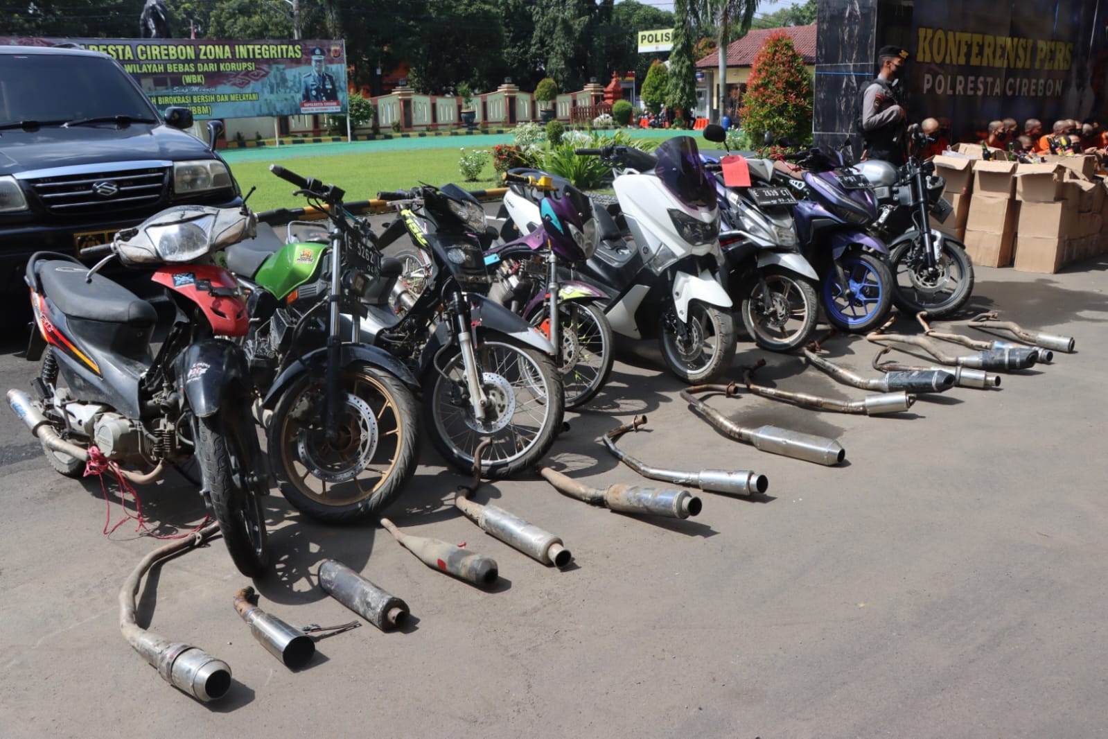 Tujuh knalpot bising ini, diamankan dari beberapa tempat. Diantaranya, di Arjawinangun, Sumber, dan juga Palimanan. Pelanggarnya diberikan peringatan tegas agar segera mengganti knalpot bising dengan knalpot yang standar. Bila tidak, motor tersebut diamankan ke Mapolresta Cirebon sampai orang tuanya datang dan mengganti knalpot tersebut dengan yang standar.
