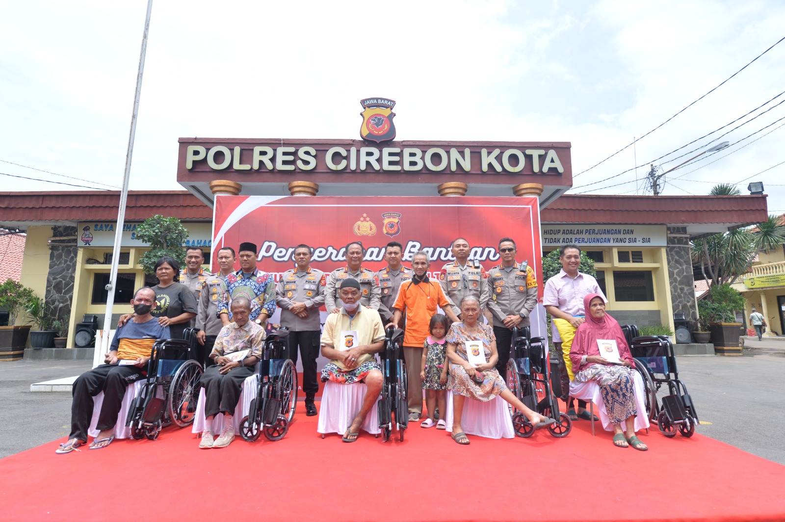 Kegiatan dilanjutkan dengan penyerahan bantuan kursi roda sebanyak 16 buah dan santunan tali asih dari Kapolda Jabar kepada penyandang disabilitas di Kota Cirebon, dengan perwakilan hadir 5 orang, Irjen Polisi Drs. Suntana didampingin Kasi Humas Polres Cirebon Kota, Iptu Ngatidja.