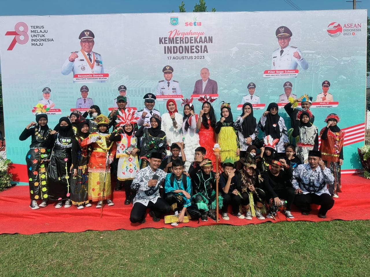 Acara berlangsung di Lapangan Upacara Sekolah SMP Negeri 20 Jalan Bukit Permata 9 Blok E Khusus Kelurahan Bakti Jaya Kecamatan Setu Kota Tangerang Selatan, Rabu (16/8/2023).