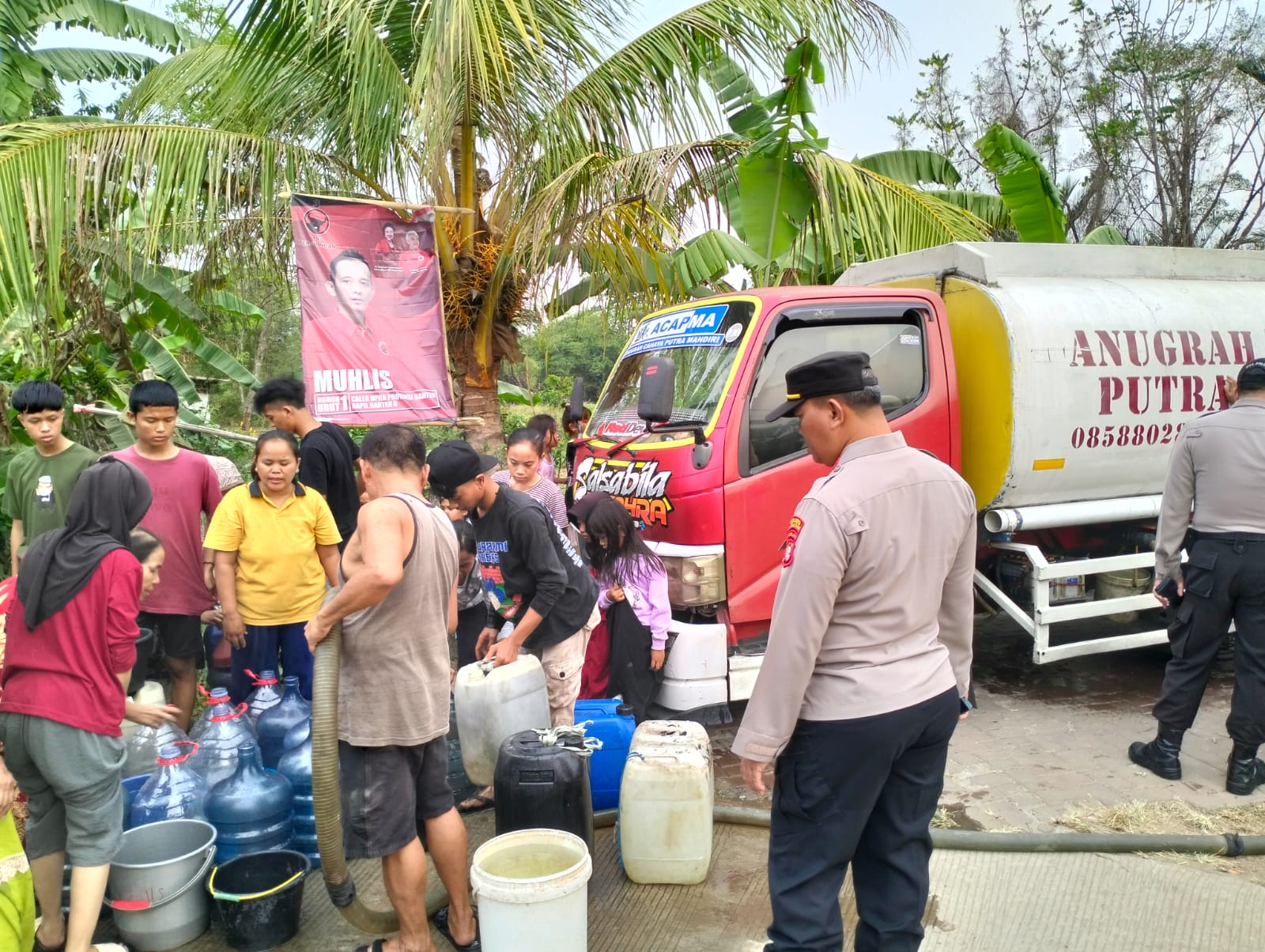 BantenOne.com, Tangerang–Polsek Legok Polres –Tangerang Selatan (Tangsel) berikan bantuan air bersih kepada warga di Kp. Ciparay, Desa Cirarab, Kec. Legok, Kab. Tangerang.