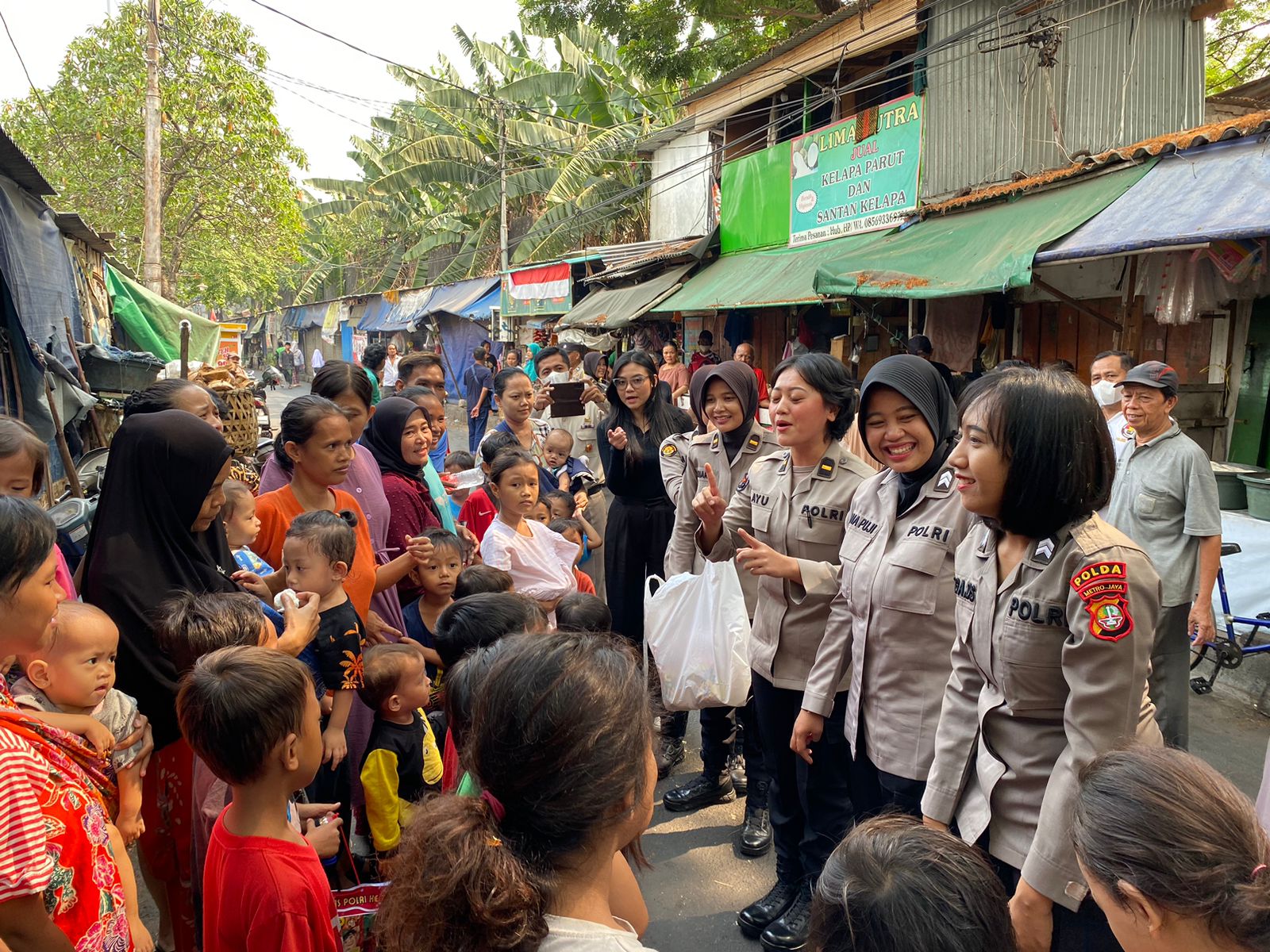Polwan Bid Humas Polda Metro Jaya turut serta dalam kegiatan Baksos tersebut dengan mengajak anak-anak untuk bermain (memberikan kuis), bernyanyi dan memberikan edukasi seputar rambu lalu lintas secara humanis.