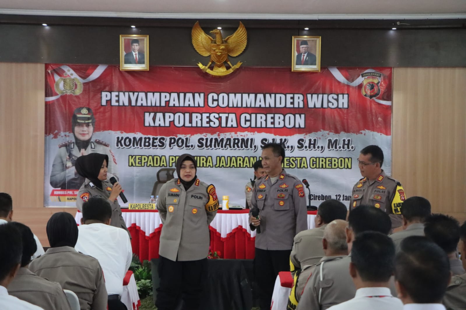 BantenOne.com, Polresta Cirebon – Kapolresta Cirebon, Polda Jabar, Kombes Polisi Sumarni menyampaikan, Commander Wish kepada PJU Polresta Cirebon, para Kapolsek Jajaran, serta para Kanit Polres dan Polsek Jajaran Polresta Cirebon, yang berlangsung di Aula Mapolresta Cirebon, Jumat (12/01/2024).