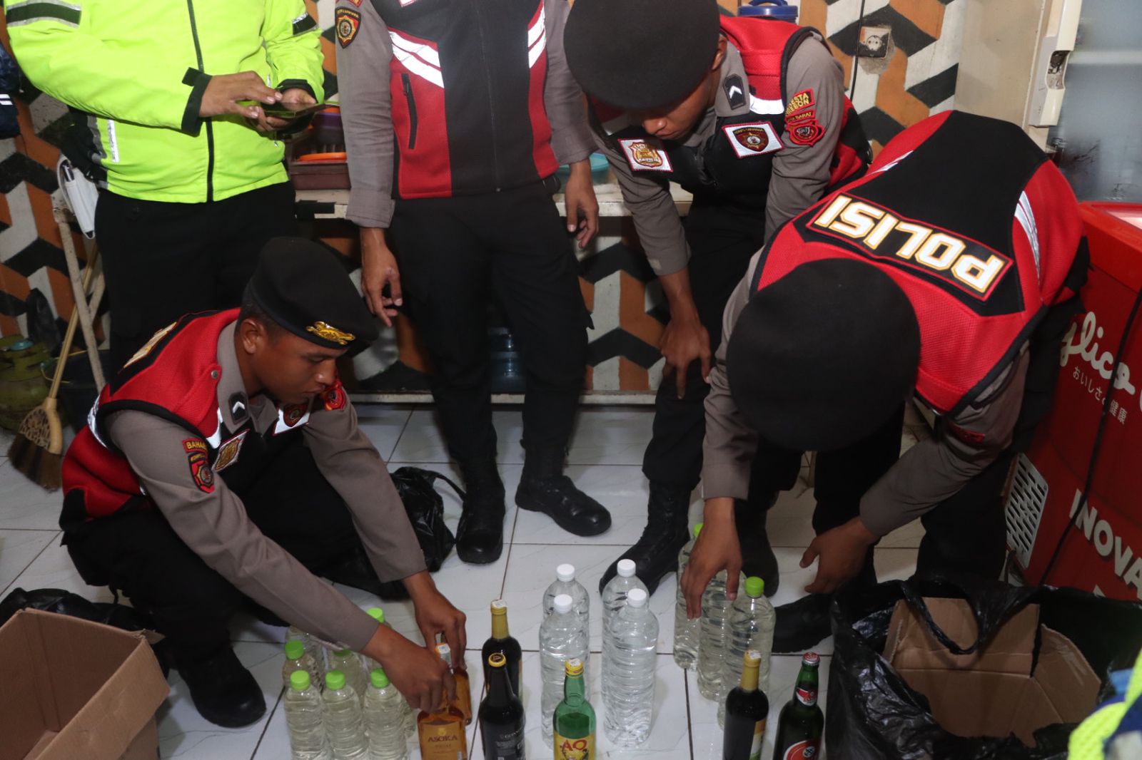 Pemeriksaan kendaraan dan identifikasi orang – orang yang berada disekitar wilayah tersebut juga dilakukan sebagai langkah Preventif untuk menghindari potensi gangguan Harkamtibmas. Hasilnya, petugas mengamankan total 356 botol Miras yang terdiri dari 226 botol Ciu, 85 botol Miras berbagai merek, 45 Liter Tuak, dan 51 knalpot brong.