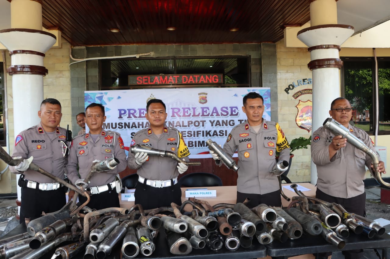 BantenOne.com, Polres Bima–Kepolisian Resor Bima Polda NTB, melalui Satuan Lantas melakukan pemusnahan hasil sitaan knalpot yang tidak sesuai spesifikasi, Rabu (07/02/24) Pukul 08.30 di depan lobi Mapolres setempat.