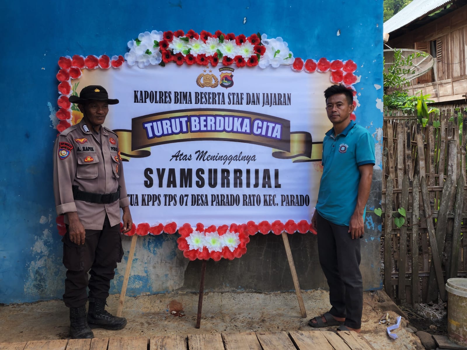 BantenOne.com, Bima–Usai melayat di kediaman Almarhum Syamsurizal Kapolres Bima AKBP Eko Sutomo SIK. MIK., mengirimkan karangan bunga sebagai bentuk Duka Cita.