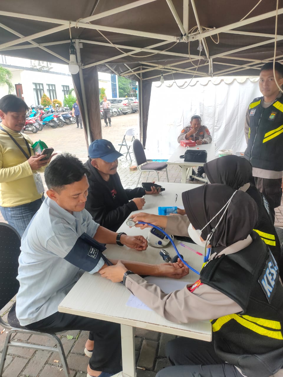 Petugas yang melaksanakan pemeriksaan Kesehatan adalah Kompol dr. Dimas, Bripda Fahreza, Bripda Ns. Yuni Siregar, S.Kep, dan Bripda Bela, A.md.Kep. yang turun langsung memberikan dukungan Kesehatan kepada 33 orang, diantaranya 6 orang dari anggota Polri dan 27 orang dari PPK, KPPS, saksi dan Saksi Partai.