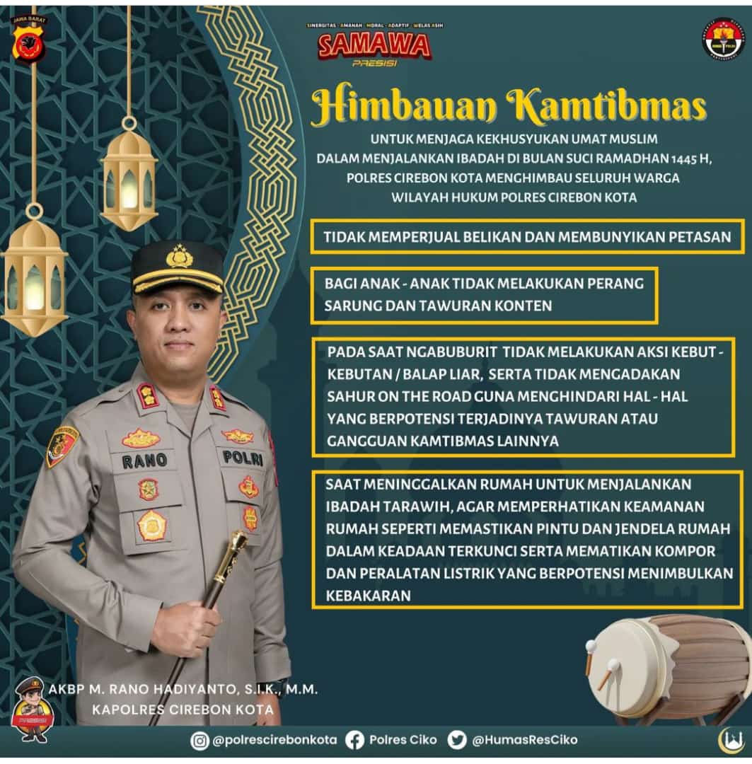 BantenOne.com – Polres Cirebon Kota – Kepolisian Resor Polres Cirebon Kota menghimbau seluruh masyarakat Kota Cirebon untuk dapat bersama – sama menjaga Kamtibmas dengan baik selama bulan Ramadan. Hal tersebut untuk menjaga khususnya Umat Muslim yang sedang melaksanakan Ibadah Puasa, Kamis (14/3/2024).