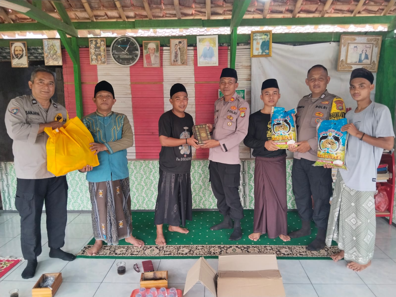 Dalam kegiatan tersebut, Kanit Binmas AKP Haryono didampingi oleh Bhabinkamtibmas Kelurahan Curug Kulon AIPTU Sanjaya dan Bhabinkamtibmas Desa Cukanggakih BRIPKA Sudirta. Mereka memberikan bantuan berupa paket sembako dan Al Quran kepada Pengurus Pondok Ustaz Saeful Hadad.