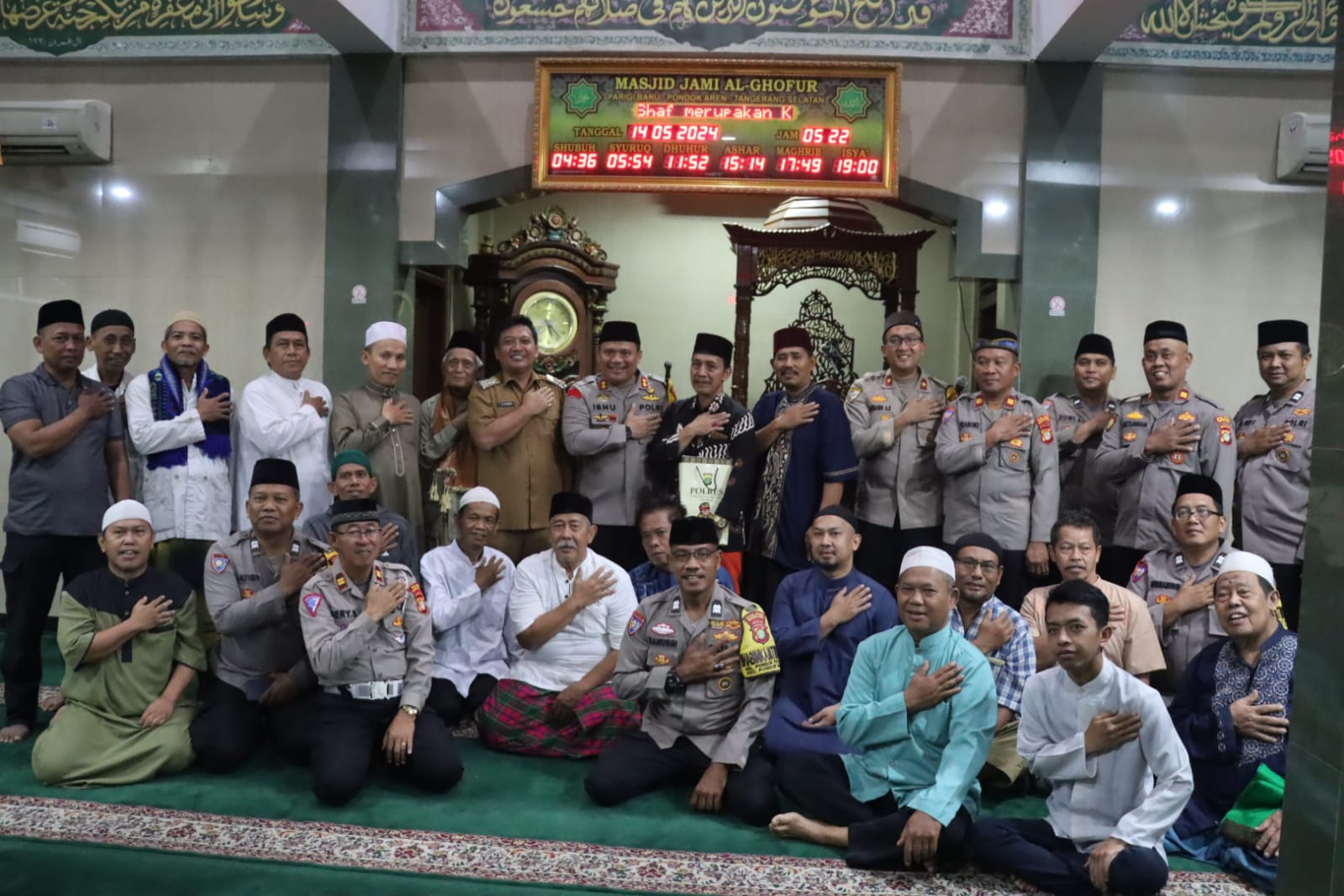 Seperti pada selasa (14/5) pagi dengan didampingi Camat dan Kapolsek Pondok Aren, Kapolres Tangsel laksanakan subuh berjamaah di Masjid Jami Al Ghofur yang beralamat di Jalan Setu Raya, Kelurahan Parigi Baru, Kecamatan Pondok Aren, Kota Tangerang Selatan.