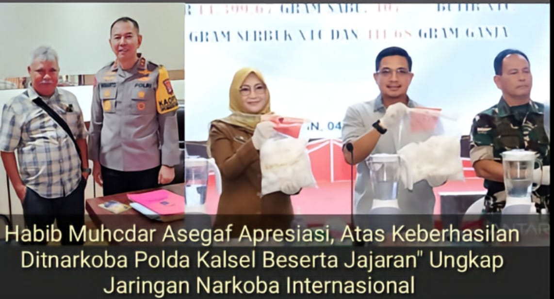 BantenOne.com, Kalsel – Dewan Kehormatan Lembaga Adat Dayak Kalimantan Selatan Habib Muhcdar Asegaf sangat mengapresiasi Ditnarkoba Polda Kalsel Kombes Pol Kelana Jaya beserta jajaran yang telah berhasil mengungkap jaringan narkoba internasional yang beroperasi lintas negara ” Rabu 5 Juni 2024.