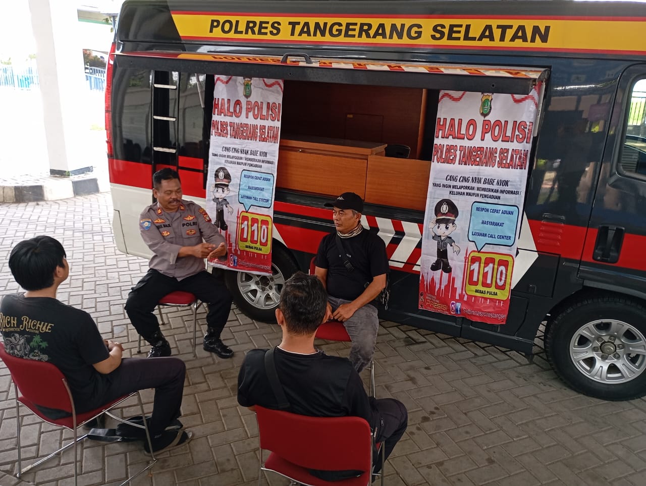 Petugas Sat Binmas Polres Tangerang Selatan secara aktif menyampaikan informasi kepada masyarakat di Terminal BSD Tim, Lengkong Gudang, Kec. Serpong, Kota Tangerang Selatan. Mereka juga memberikan penjelasan mengenai cara penggunaan layanan “Hallo Polisi 110” serta menjawab pertanyaan dari masyarakat terkait layanan tersebut.