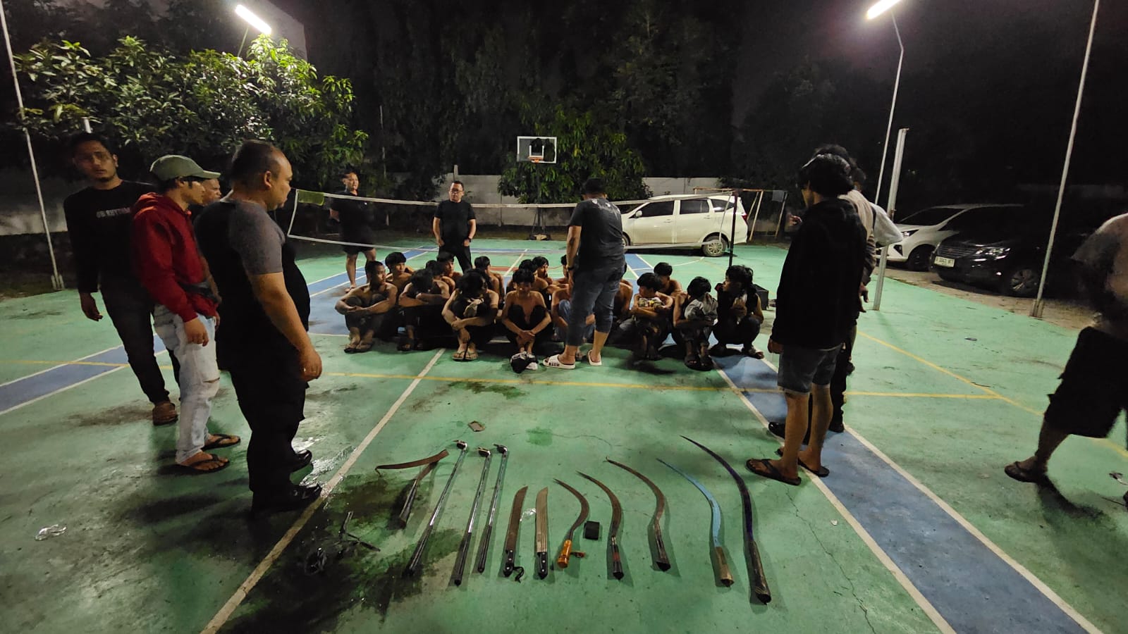 Pada pukul 03.00 WIB, petugas tiba di lokasi kejadian dan berhasil mengamankan 22 orang yang diduga terlibat. Selain itu, petugas juga berhasil menyita sejumlah barang bukti berupa dua buah bendera dengan tulisan “Anak Komplek we are few but never run”, enam buah senjata tajam jenis celurit, dua buah golok, serta tiga stick golf yang diduga akan digunakan dalam aksi kekerasan.