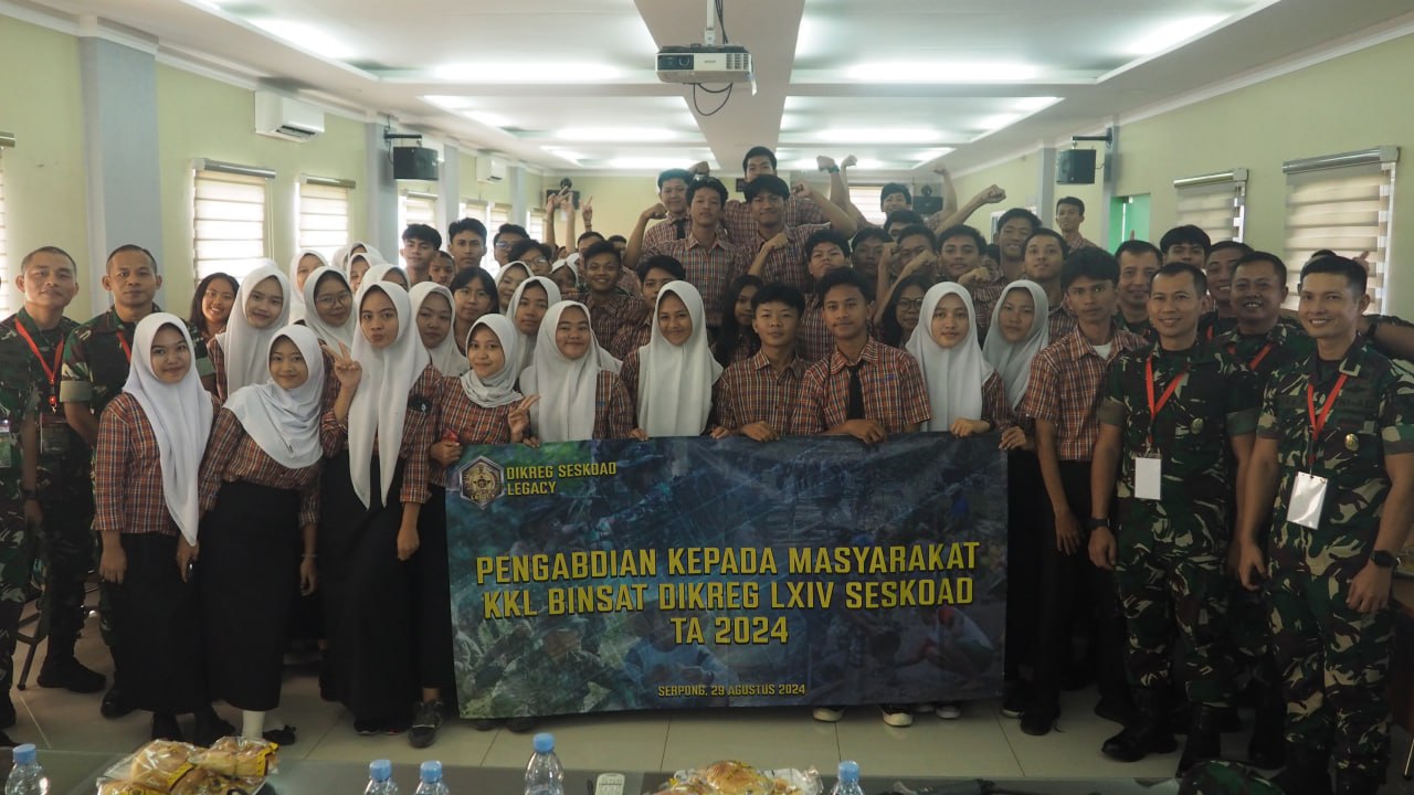 BantenOne.com, Tangsel | Tanamkan Nilai-nilai kebangsaan sejak dini kepada generasi penerus Bangsa,Siswa KKL Binsat Dikreg LXIV Seskoad, Sekolah Staf dan Komando Angkatan Darat (Seskoad) memberikan materi wawasan Kebangsaan kepada para siswa – siswi SMK Pustek Tangerang Selatan, Kamis (29/9/2024).