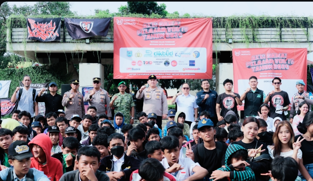 BantenOne.com |PAMULANG – Semangat persatuan dan komitmen antikekerasan mewarnai Alun-alun Pamulang, Jumat (13/02/2026), saat Tangsel Bersatu menggelar Aksi Damai Pelajar Vol.4. Kegiatan tahunan ini mempertemukan sekitar 227 siswa tingkat SMP hingga SMK dari puluhan sekolah di Kota Tangerang Selatan, dalam satu panggung kolaborasi dan edukasi.