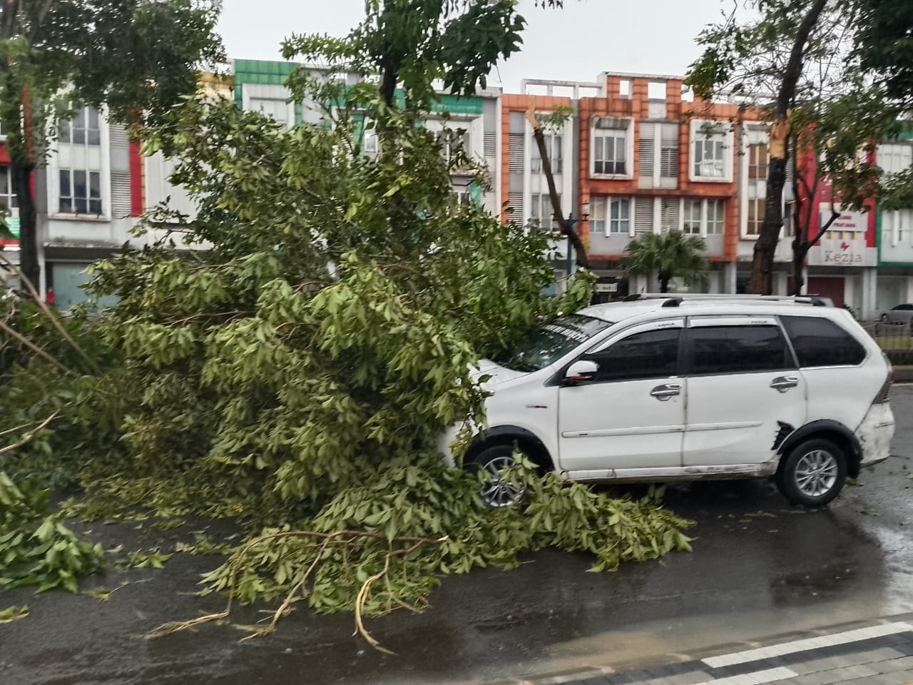 BantenOne.com | Kabupaten Tangerang – Sebuah mobil minibus berwarna putih milik seorang jurnalis tertimpa pohon akibat hujan deras disertai angin kencang di kawasan Perumahan Sumarecon, tepatnya di depan Ruko Aristoteles, Kelurahan Medang, Kecamatan Pagedangan, Kabupaten Tangerang, pada Senin (30/3/2026) sekitar pukul 14.00 WIB.