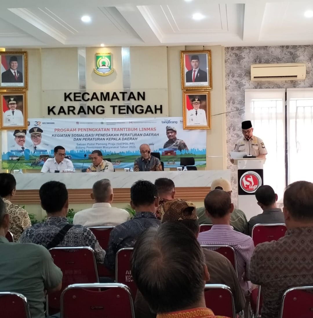 BantenOne. Com | Kota Tangerang,. – Dalam upaya memperkuat kesadaran hukum di tengah masyarakat, Satuan Polisi Pamong Praja (Satpol PP) Kota Tangerang melalui Bidang Pembinaan Masyarakat menyelenggarakan kegiatan **Sosialisasi Penegakan Peraturan Daerah (Perda) dan Peraturan Kepala Daerah (Perkada) di Aula Kecamatan Karang Tengah, Kamis (17/7/2025). Kegiatan ini melibatkan para lurah, ketua RT/RW, tokoh masyarakat, serta warga se-Kecamatan Karang Tengah.