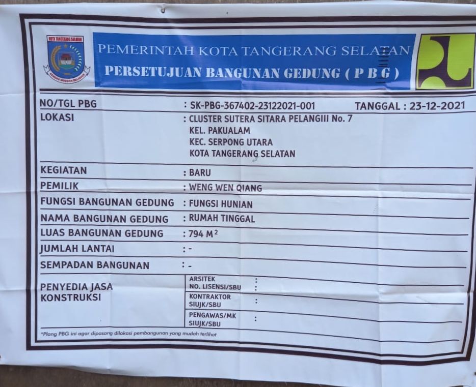 BantenOne.Com – Tangsel – Kegiatan bangunan yang berlokasi jalan Alam Sutera Cluster Pelangi 2/7 Kelurahan Paku Alam Serpong Utara Tangsel diduga tidak sesuai dengan PBG ( Persetujuan Bangunan Gedung ) SK- PBG- 367402-23122021-001 tanggal 23-12-2021 atas nama Weng Wen Qiang dengan ijin Rumah Tinggal.
