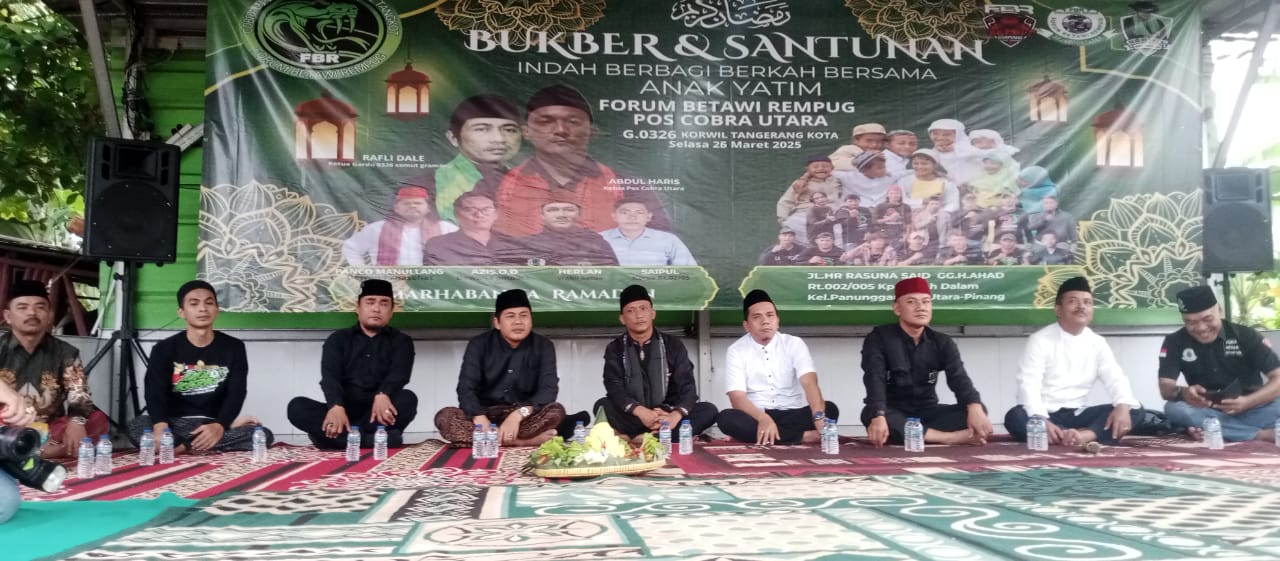 Banten one| Tangerang – Buka Puasa Bersama dan Santunan Anak Yatim Piatu yang diinisiasi oleh Organisasi Masyarakat Forum Betawi Rempug Cobra Utara P.G 0326 Korwil Tangerang Kota dengan mengusung tema “INDAH BERBAGI BERKAH BERSAMA” cukup menyita perhatian warga sekitar untuk menghadiri acara yang dilaksanakan di Jln.HR. Rasuna Said, Gg. H. AHAD RT.02/RW.05 Kp. Sawah Dalam Panunggangan Utara Pinang.(26/03/2025).