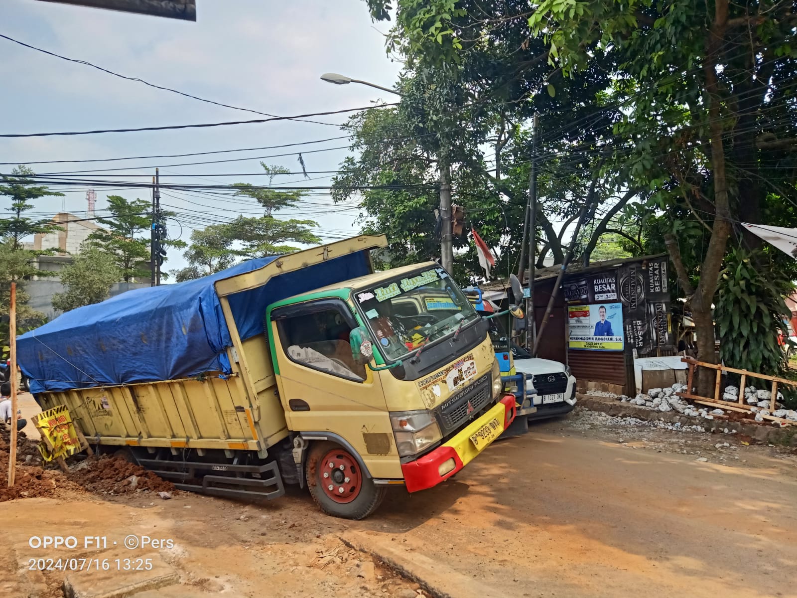 BantenOne.com , Tangsel| Dua Unit mobil truk bermuatan pasir dan pakan ayam kejeblos di Galian drainase jalan H.Taip kelurahan Kedaung kecamatan Pamulang kota Tangerang Selatan, Selasa 16/07/2024.