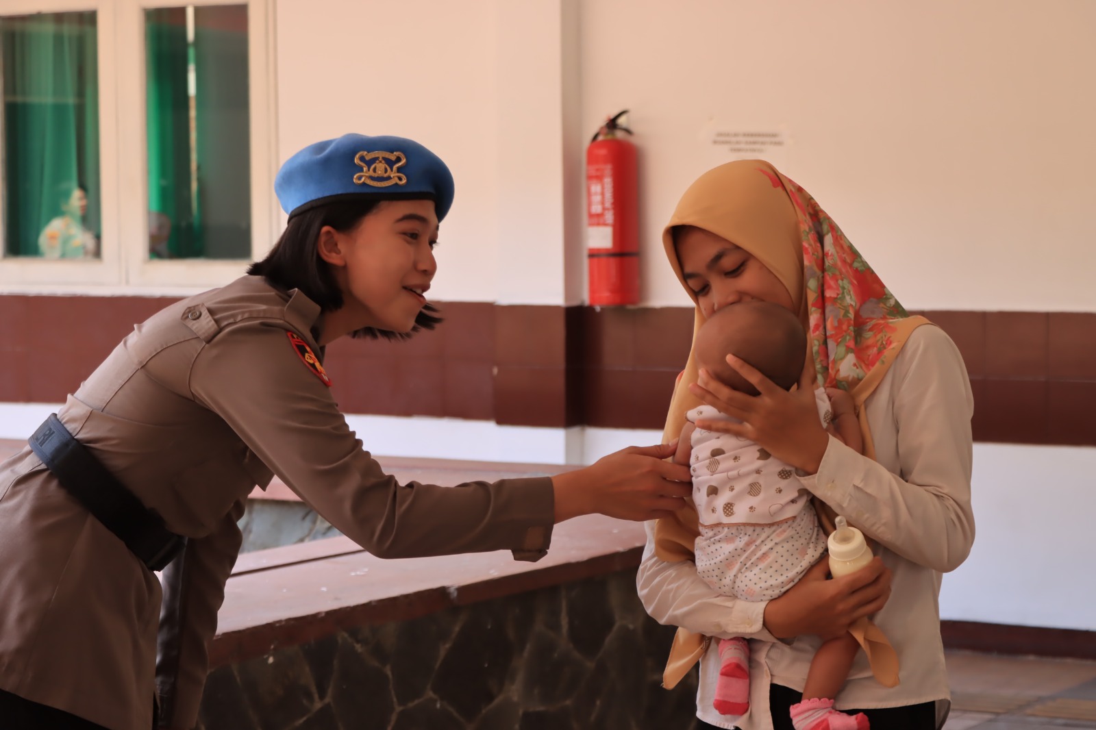 Di sisi lainnya, nampak juga seorang Polwan cantik yang dengan tulus sebagai seorang ibu menggendong balita warga seakan itu adalah anaknya sendiri.