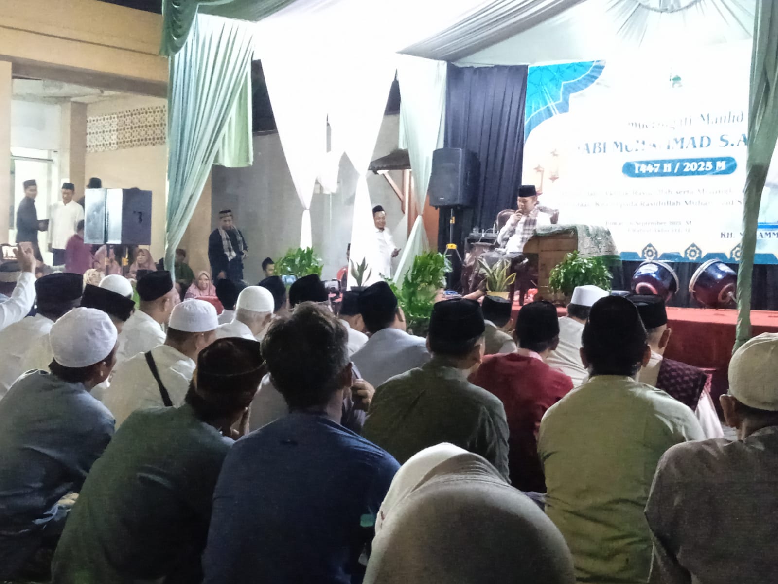 BantenOne.com | Kota Tangerang,- Suasana penuh kekhusyukan dan semangat keagamaan menyelimuti Masjid Jami’ Nurul Hikmah, dalam rangka memperingati Maulid Nabi Besar Muhammad SAW 4 Rabiul Akhir 1447 H, Jum’at (26/9/2025) Jam 19.30 wib, Jalan Sultan Ageng Tirtayasa RT 07/08 Kelurahan Kunciran Indah, Kecamatan Pinang Kota Tangerang. Penceramah KH. Muhammad Syauqi MZ(Putra Almarhum KH.Zainudin MZ) dan penampilan Tim Hadroh Remaja IKRIMNUH. Dengan tema “Meneladani Akhlak Rasulullah serta Meningkatkan Kecintaan Kita Kepada Rasulullah Muhammad SAW”.