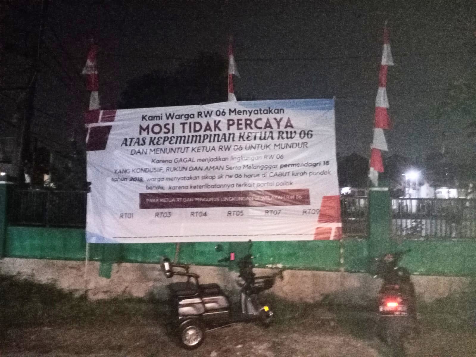 BantenOne.com – Tangerang Selatan –  Warga RW 06 Kelurahan Pondok Benda melalui MTP (Mosi Tidak Percaya) yang tertera pada spanduk yang jelas dengan narasi Melanggar Permendagri 18 Tahun 2018 pasal 3 ayat 2 huruf F ( tidak berafiliasi kepada Partai Politik), warga menyatakan sikap SK (Surat Keputusan ) RW 06 harus di cabut Lurah Pondok Benda di duga kuat cacat hukum.