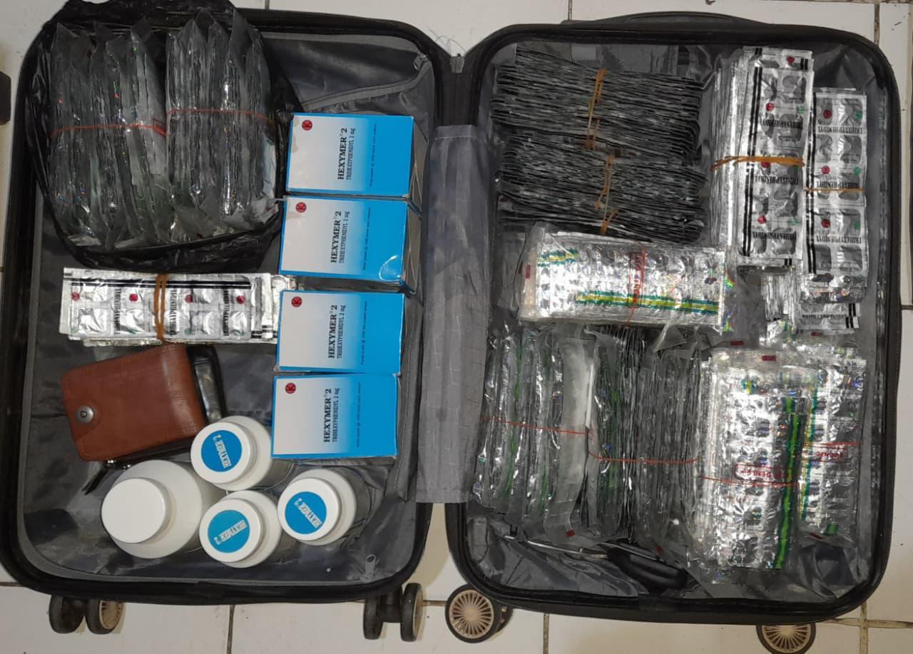 4 unit handphone, 1 printer label, puluhan kardus kemasan, plastik pembungkus, serta koper dan tas ransel berisi obat.