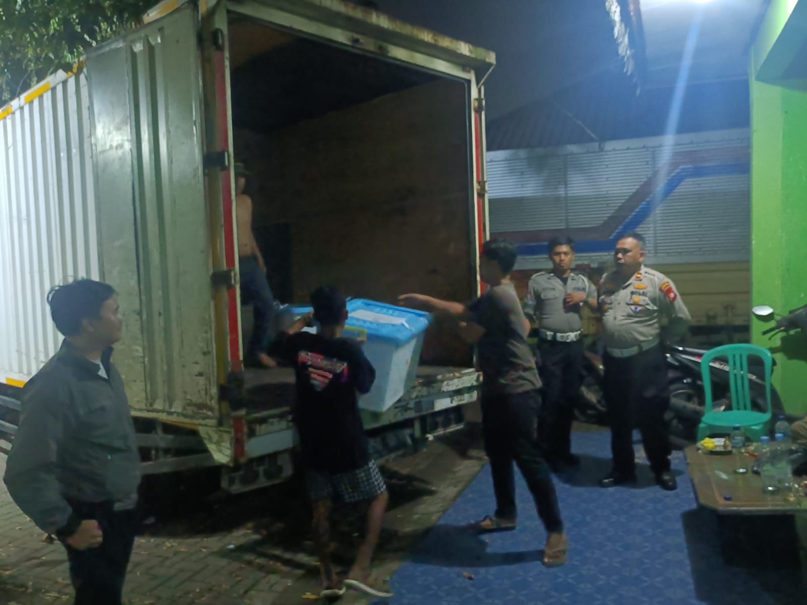 BantenOne.com,Tangsel, Rabu (28/2) malam, empat personel Polsek Legok Polres Tangerang Selatan dipimpin Ipda J. Sialahi, S.H. (Kanit Lantas) laksanakan pengamanan dan pengawalan penarikan logistik Pemilu 2024 dari Gudang PPK Legok menuju Gudang KPU Kab. Tangerang.