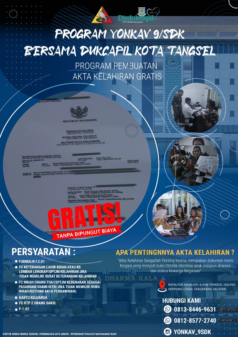 Adapun saat ini Dukcapil Tangsel dalam pengurusan dokumen akta kelahiran menggunakan sistem baik online dan offline, namun masih terdapat masyarakat yang belum memahami sistem ataupun mekanisme tersebut. Yonkav 9/SDK dalam hal ini bekerjasama dengan Dukcapil Tangsel pada program pembuatan Akta Kelahiran dengan cara melaksanakan jemput bola untuk memberikan edukasi kepada masyarakat terkait tata cara pengurusan Akta Kelahiran sehingga diharapkan dapat membantu masyarakat sekitar.