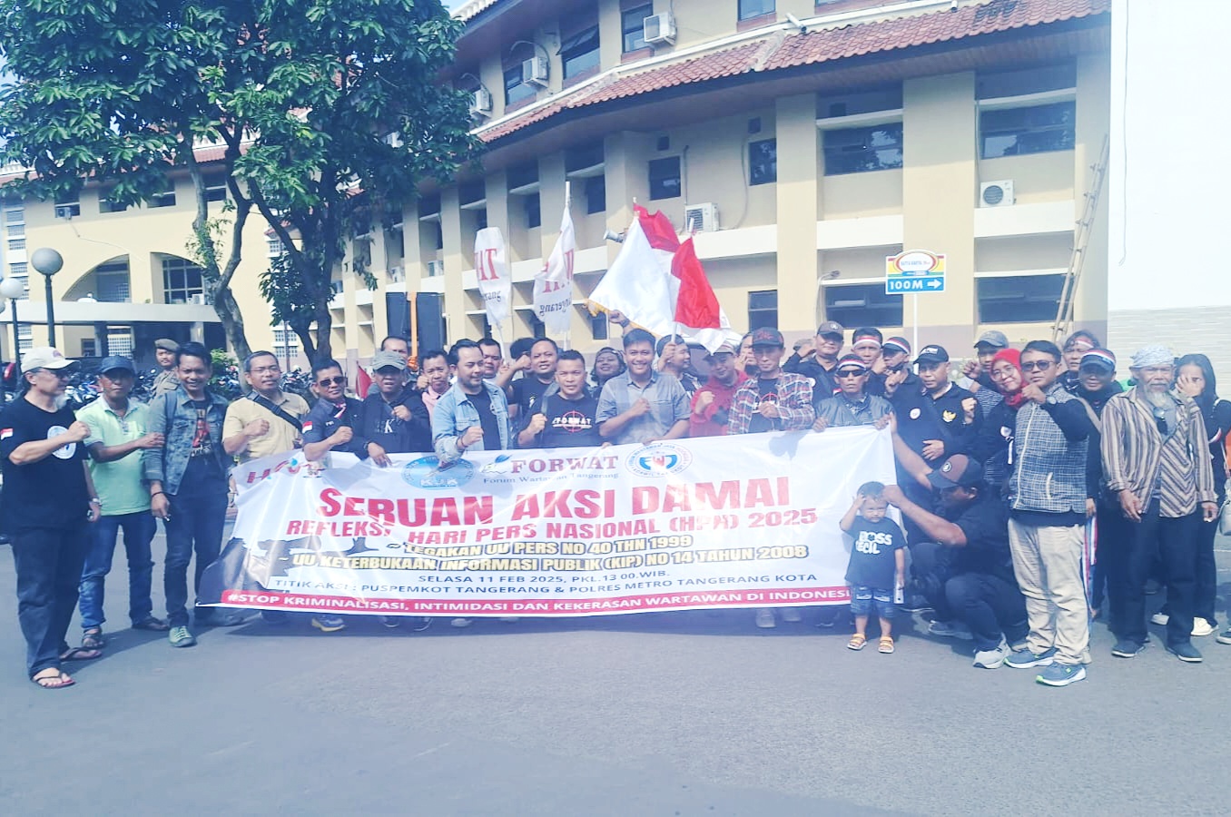 BANTENONE.COM | Kota Tangerang. – Dalam rangka memperingati Hari Pers Nasional (HPN), sejumlah komunitas wartawan di Kota Tangerang, yakni Forum Wartawan Tangerang (Forwat), Komunitas Jurnalis Kompeten (KJK), dan Forum Wartawan Jaya Indonesia (FWJI), menggelar aksi damai di Polres Metro Tangerang Kota dan Pusat Pemerintahan Kota Tangerang, pada (11/02/25).
