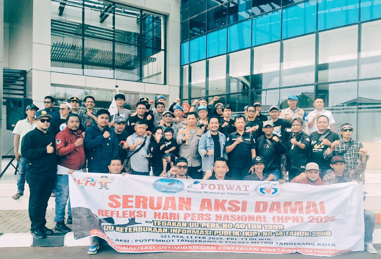 BANTENONE.COM | Kota Tangerang. – Dalam rangka memperingati Hari Pers Nasional (HPN), sejumlah komunitas wartawan di Kota Tangerang, yakni Forum Wartawan Tangerang (Forwat), Komunitas Jurnalis Kompeten (KJK), dan Forum Wartawan Jaya Indonesia (FWJI), menggelar aksi damai di Polres Metro Tangerang Kota dan Pusat Pemerintahan Kota Tangerang, pada (11/02/25).