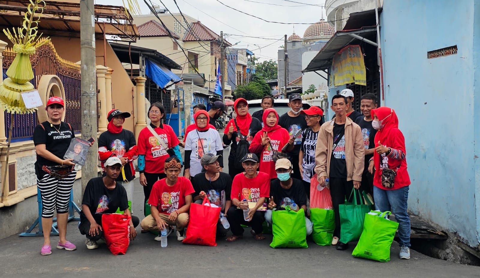 BantenOne.com, Jakarta-Tim kordinasi relawan Ganjar Pranowo-Mahfud MD,melakukan ‘blusukan’ atau door to door, serta canvasing secara serentak untuk mensosialisasikan, mendatangi rumah warga bagi bagi kaos dan tempel stiker, untuk calon pemilih Presiden Ganjar Pranowo Mahfud MD ,minggu,(5/11/2023) di Jalan kebantenan 3 ,Semper cilincing Jakarta Utara..