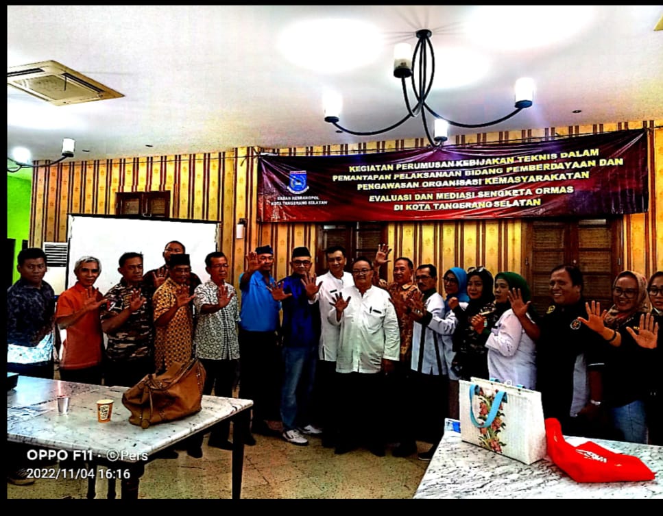 BantenOne.com ,Tangsel-Kegiatan perumusan kebijakan teknis dalam pemantapan pelaksanaan bidang pemberdayaan dan pengawasan organisasi kemasyarakatan evaluasi dan mediasi sengketa ormas di kota Tangerang Selatan, acara yang berlangsung di restoran Sai pisan serpong tangsel jum,at 04/11/2022.